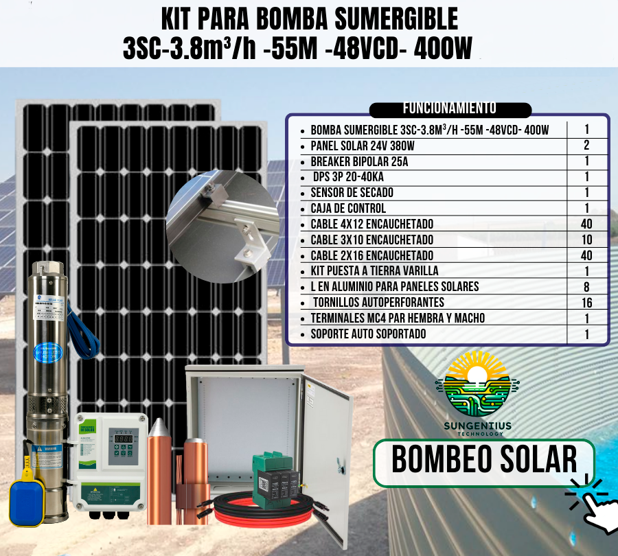 KIT BOMBA SUMERGIBLE 3SC-3.8M³/H -55M -48VCD- 400W