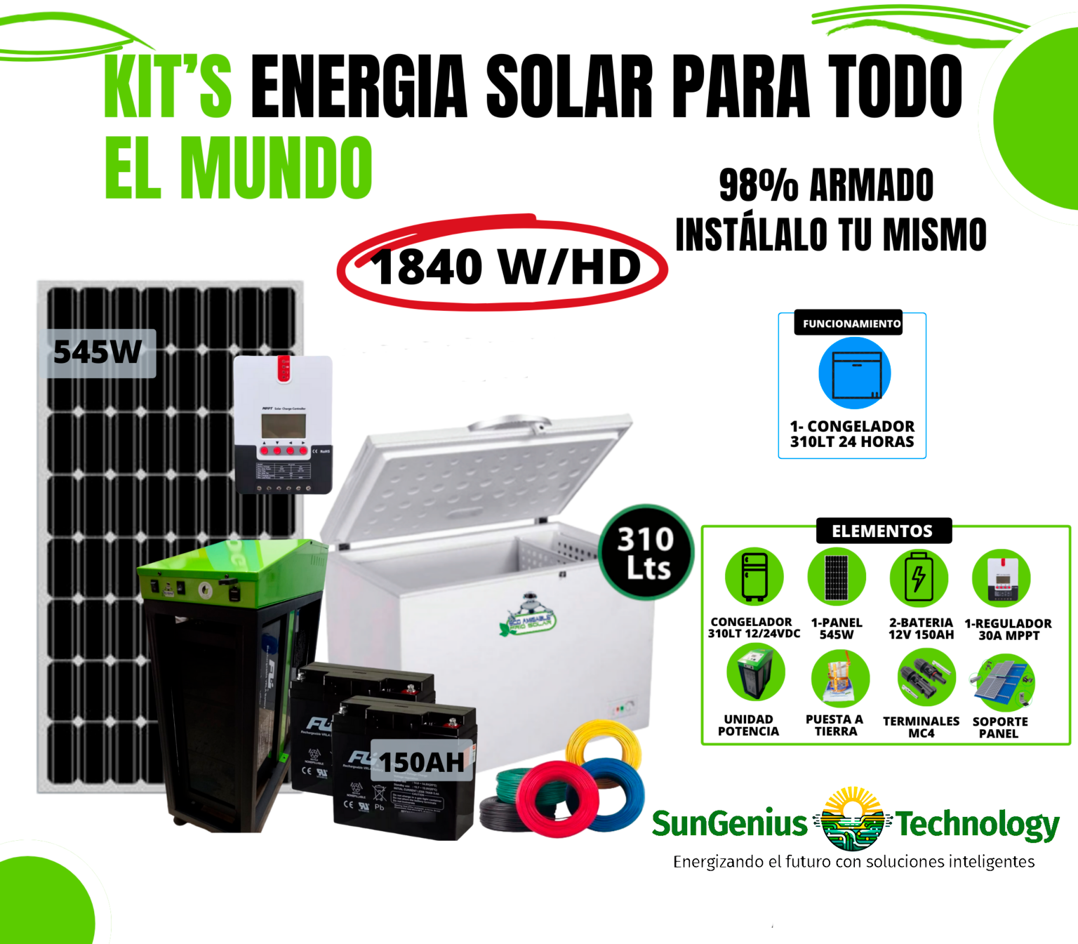 Este congelador de 310 litros cuenta con un diseño versátil y eficiente que permitirá aprovechar al máximo el espacio disponible, garantizando una conservación adecuada de tus productos congelados. Autonomía o respaldo para 2 días sin sol. 1840W/HD.