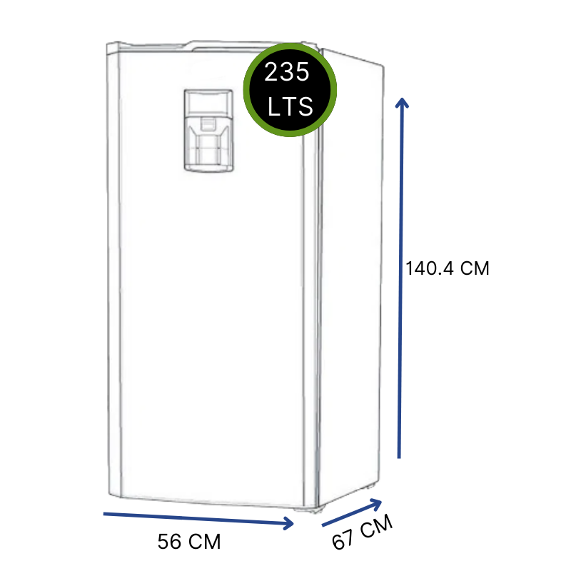 Esta nevera de 235 Litros cuenta con anaqueles de gran capacidad y resistencia para botellas y recipientes de cualquier tamaño incluso 2 litros. También cuenta con un dispensador de agua, cajón de frutas y verduras y bandejas en cristal templado.
